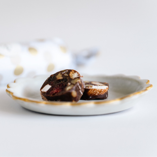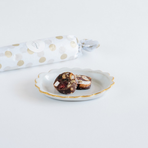 LE PONTのクッキーと、ナッツ、ドライフルーツ、マシュマロをガナッシュにたっぷり加えた サラミの形をしたチョコレート。